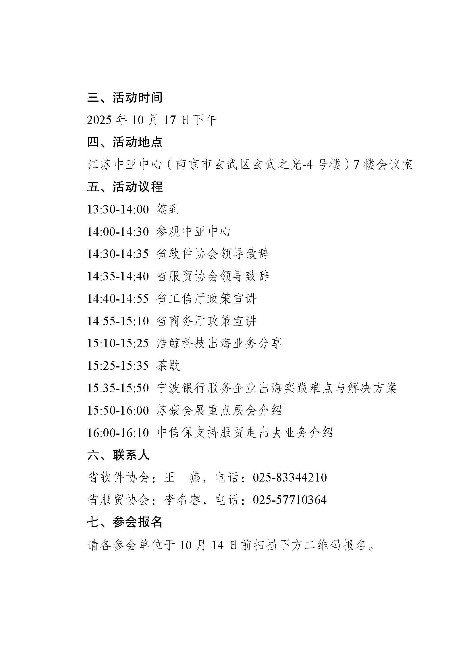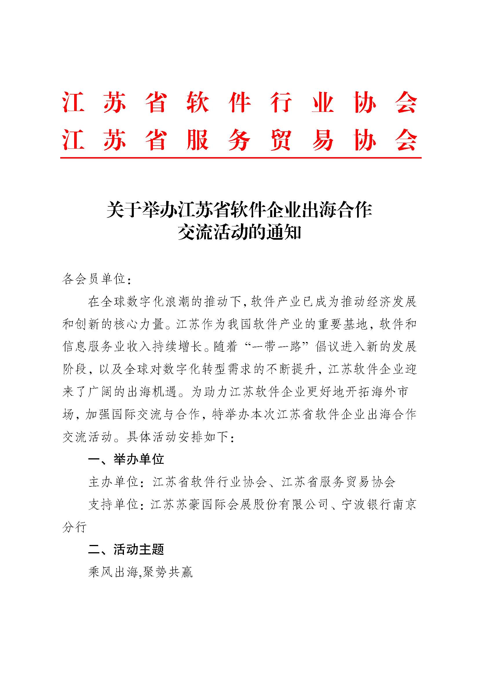 在全球数字化浪潮的推动下,软件产业已成为推动经济发展和创新的核心力量。江苏作为我国软件产业的重要基地,软件和信息服务业收入持续增长。随着 “一带一路” 倡议进入新的发展阶段,以及全球对数字化转型需求的不断提升,江苏软件企业迎来了广阔的出海机遇。为助力江苏软件企业更好地开拓海外市场,加强国际交流与合作,特举办本次江苏省软件企业出海合作交流活动。具体活动安排如下: